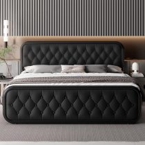 Feonase King Size Bed Frame, Upholstered Bed Frame with Faux Leather Headboard, Heavy Duty Platform Bed with Strong Metal Slats, 12 Inch Under-Bed Storage, Noise-Free, Easy Assembly, Black